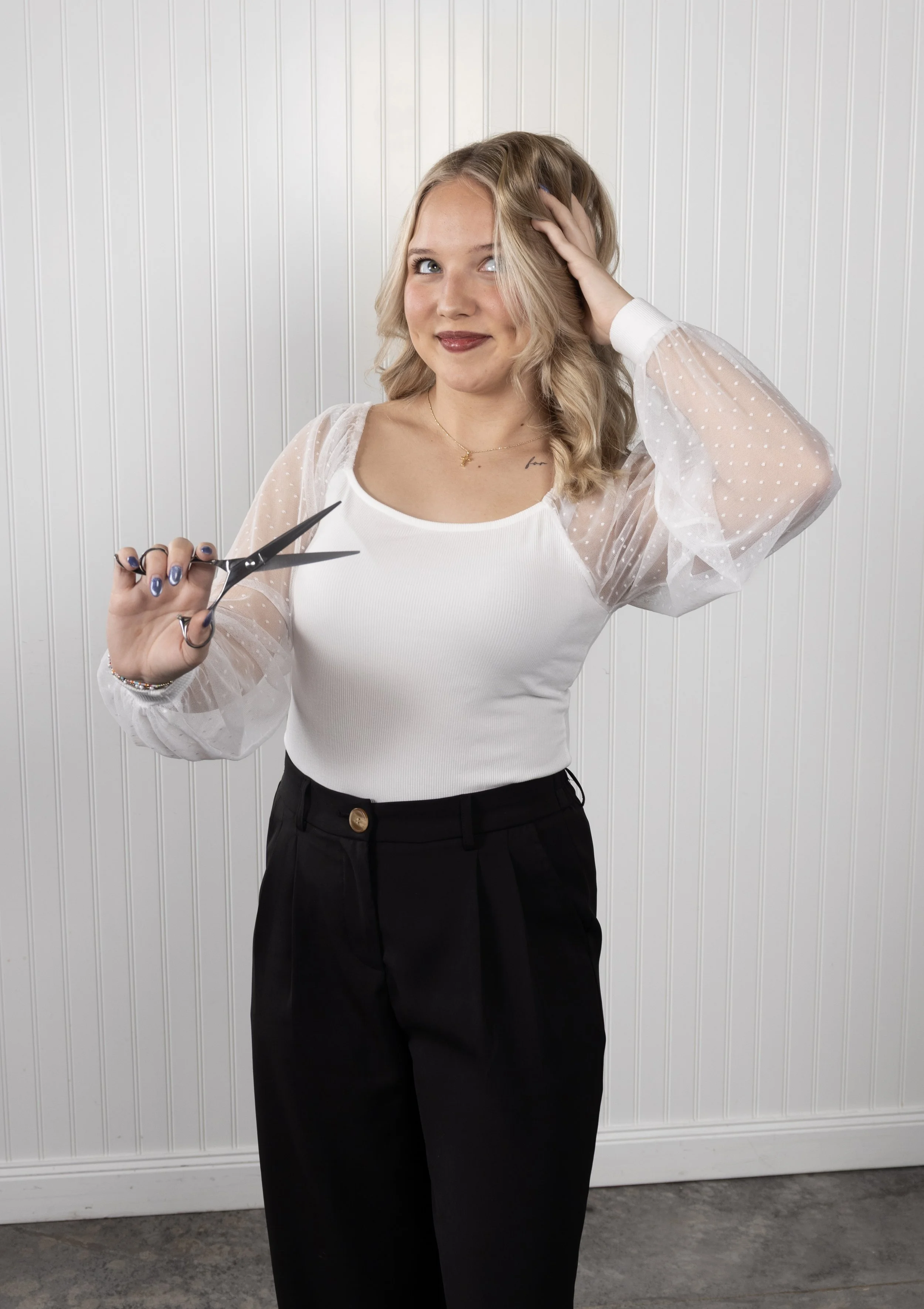 Morgan’s goal with every guest is simple: learn something new, apply it with intention, and continuously grow. Whether she’s shadowing, assisting, or taking the lead, she approaches each opportunity with curiosity, dedication, and heart. She is especially passionate about bridal hairstyling and fine-hair styling. Morgan hopes to specialize in helping women experiencing hair loss feel confident, supported, and beautiful.